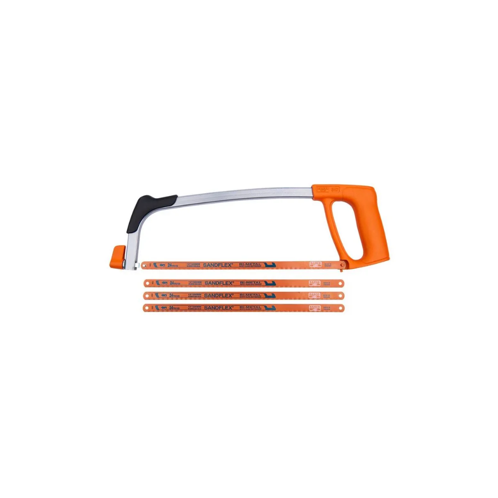 Arco de sierra mecánico Bahco 317 diseñado para cortar metal, madera y plástico con precisión. Incluye tres hojas de sierra intercambiables, lo que permite adaptarse a diferentes materiales y grosores. Su estructura robusta y mango ergonómico aseguran comodidad, control y durabilidad en aplicaciones domésticas, profesionales e industriales.