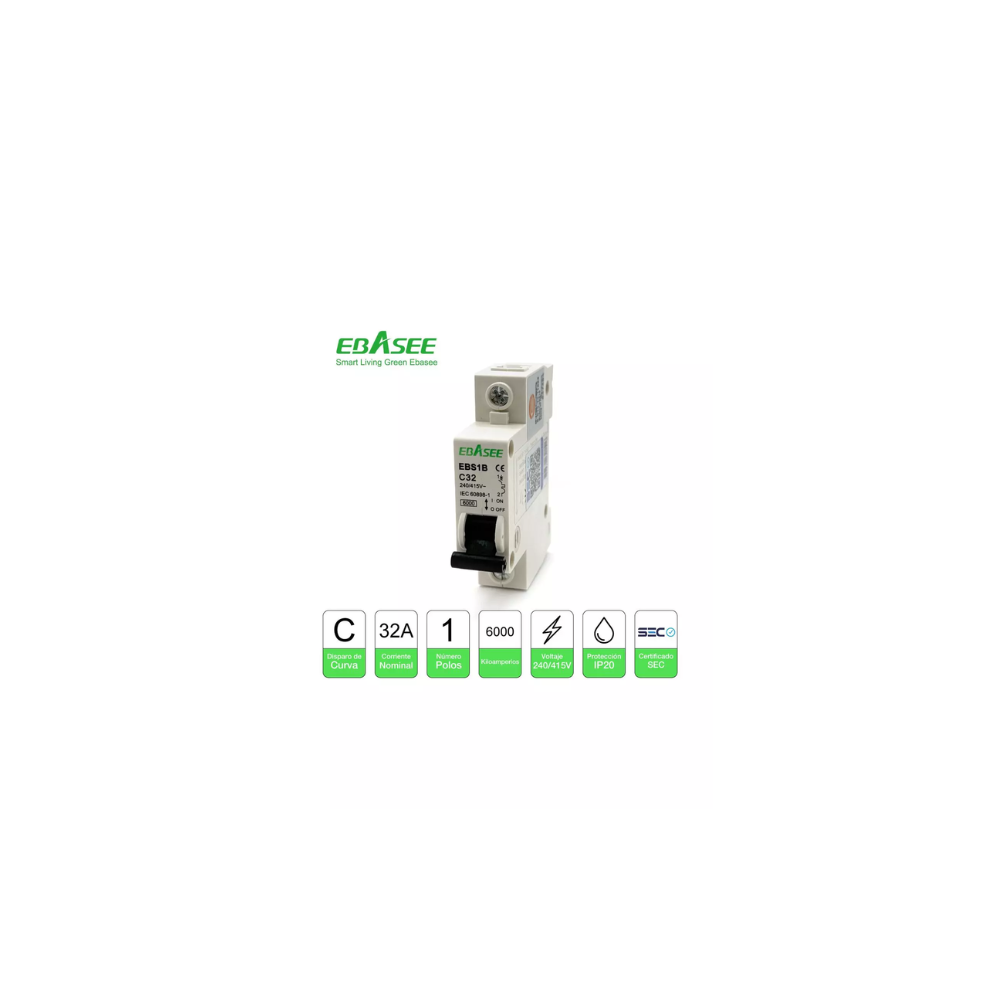 Interruptor automático unipolar de 32 amperes diseñado para protección de circuitos eléctricos contra sobrecargas y cortocircuitos. Permite la desconexión automática de la alimentación cuando se detecta una falla, protegiendo cables, equipos y dispositivos conectados. Es adecuado para aplicaciones en instalaciones residenciales, comerciales e industriales ligeras.