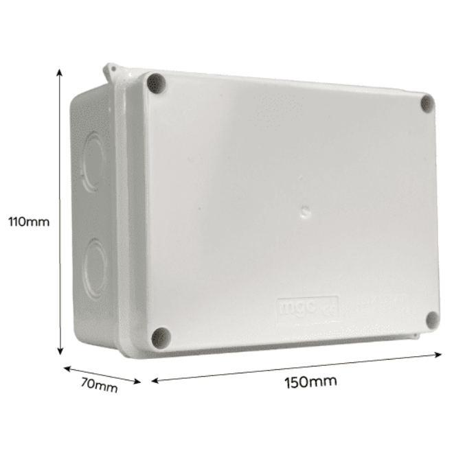 Caja de distribución estanca, fabricada en plástico de alta resistencia, dimensiones 175 x 110 x 70 mm, marca o línea MEC. Diseñada para proteger conexiones eléctricas en ambientes expuestos a humedad y polvo.