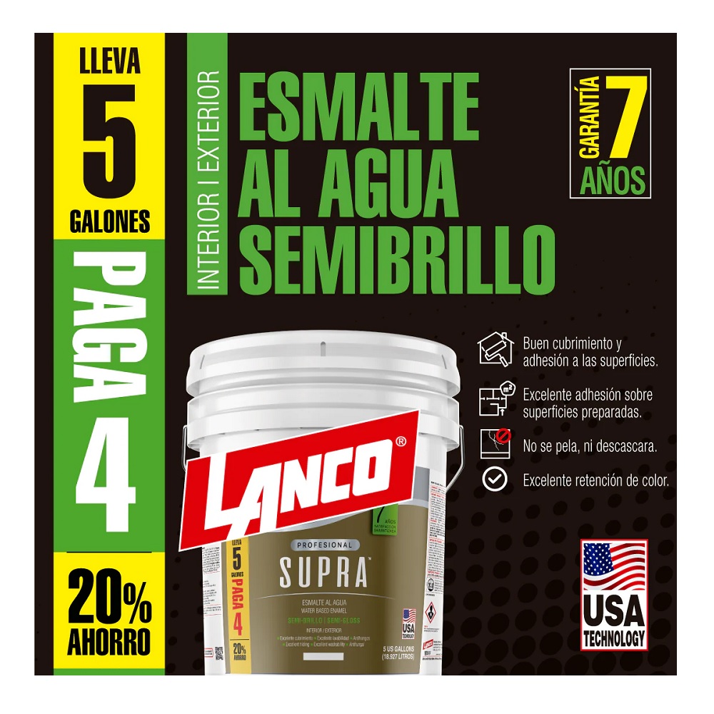 El Esmalte al Agua Supra Semibrillo Blanco 5 GL de Lanco es una pintura acrílica al agua de alta calidad formulada con resinas acrílicas que entregan un acabado semibrillo duradero, uniforme y de fácil limpieza. Está especialmente diseñada para proteger y embellecer superficies tanto interiores como exteriores, aportando una estética impecable y resistente a las condiciones habituales del hogar o proyecto residencial. Perfecta para paredes, muros, y estructuras de concreto o madera preparados adecuadamente.