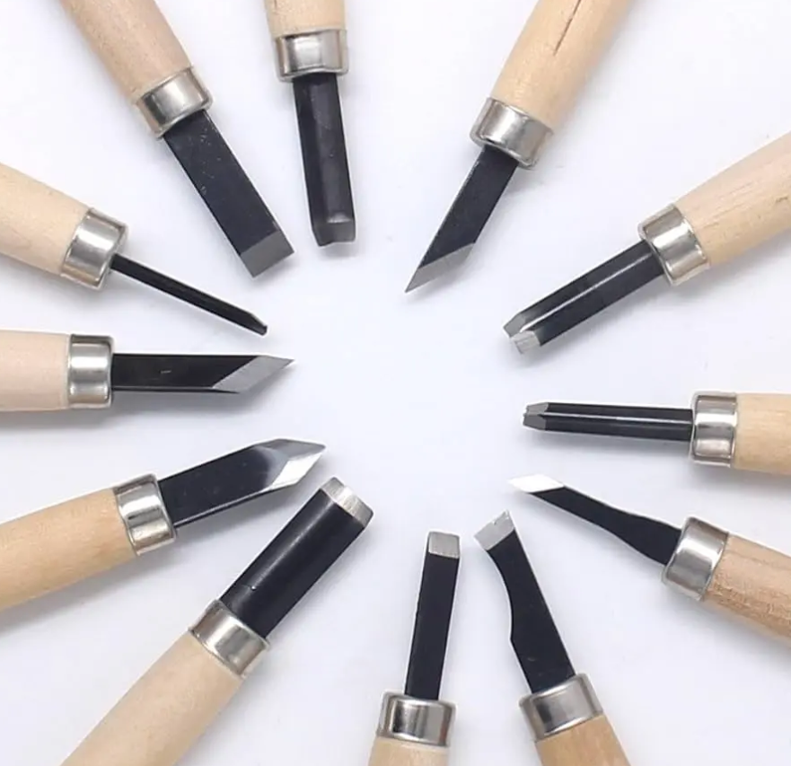 Set de gubias escolar de 12 piezas, ideal para iniciación en el tallado de madera y trabajos manuales.