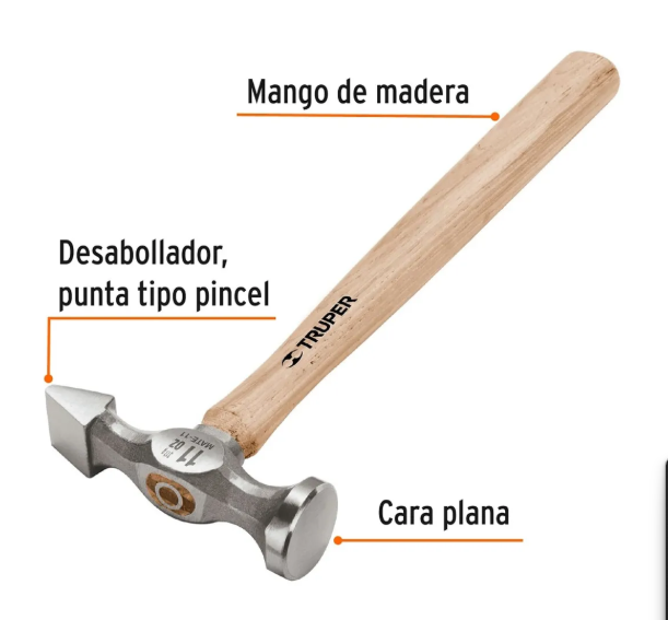 Martillo desabollador Truper MADE-11 de 311 g (11 oz), fabricado con cabeza de acero forjado de alta resistencia que garantiza durabilidad y precisión en trabajos de hojalatería. Cuenta con una cara plana para golpear y una punta larga diseñada para moldear, estirar y dar forma a láminas metálicas con mayor control. Su mango de madera pulido y laqueado proporciona un agarre cómodo y seguro, permitiendo un manejo firme durante el uso. Herramienta liviana y balanceada, ideal para trabajos de reparación de carrocerías, desabollado y ajustes en metal, ofreciendo un acabado más fino sin dañar la superficie.