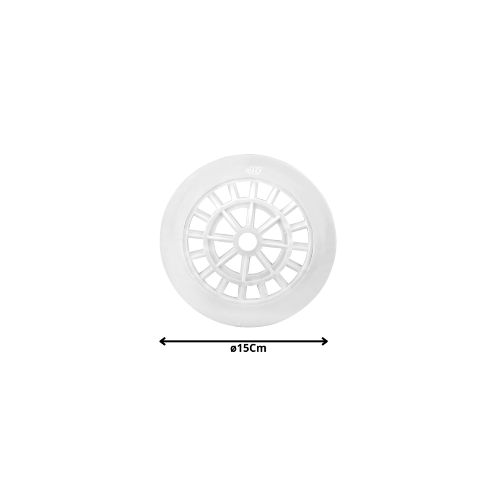 Descripción: Rejilla sanitaria de forma redonda, fabricada en plástico rígido color blanco, diseñada para cubrir piletas de desagüe de 15 cm (150 mm). Permite el paso de agua residual mientras retiene residuos sólidos de mayor tamaño, facilitando el drenaje y evitando obstrucciones en sistemas sanitarios. Material resistente a la humedad y adecuado para instalaciones domésticas, comerciales o industriales ligeras.