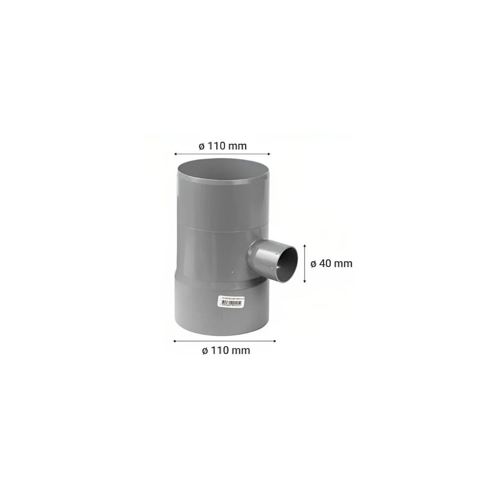 Accesorio en forma de “T” para sistemas de evacuación sanitaria, fabricado en PVC rígido color gris. Permite derivar una tubería principal de 110 mm hacia una derivación de 40 mm mediante uniones rígidas cementadas. Diseñado para instalaciones de desagüe por gravedad de aguas residuales domésticas y comerciales.