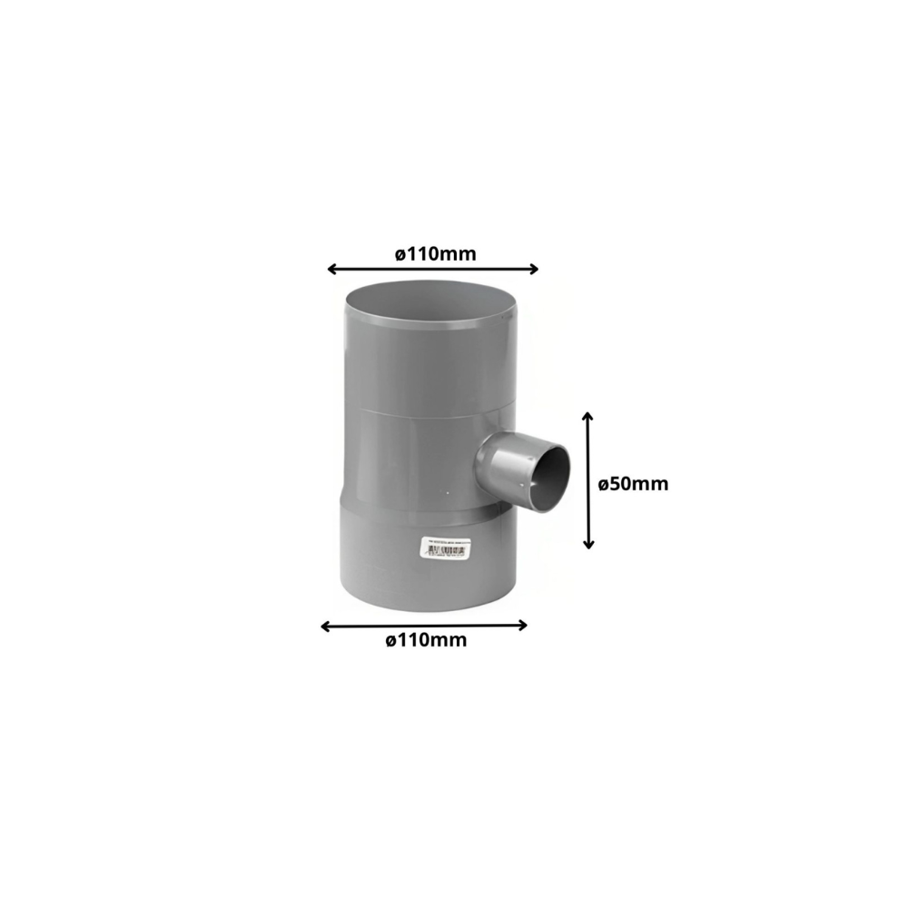 Accesorio en forma de “T” fabricado en PVC sanitario rígido gris, utilizado en instalaciones de evacuación de aguas residuales por gravedad. Permite derivar el flujo desde una tubería principal de 110 mm a una secundaria de 50 mm manteniendo eficiencia hidráulica en sistemas sanitarios residenciales y comerciales. Facilita conexiones de tubos mediante unión cementada para asegurar estanqueidad y durabilidad.